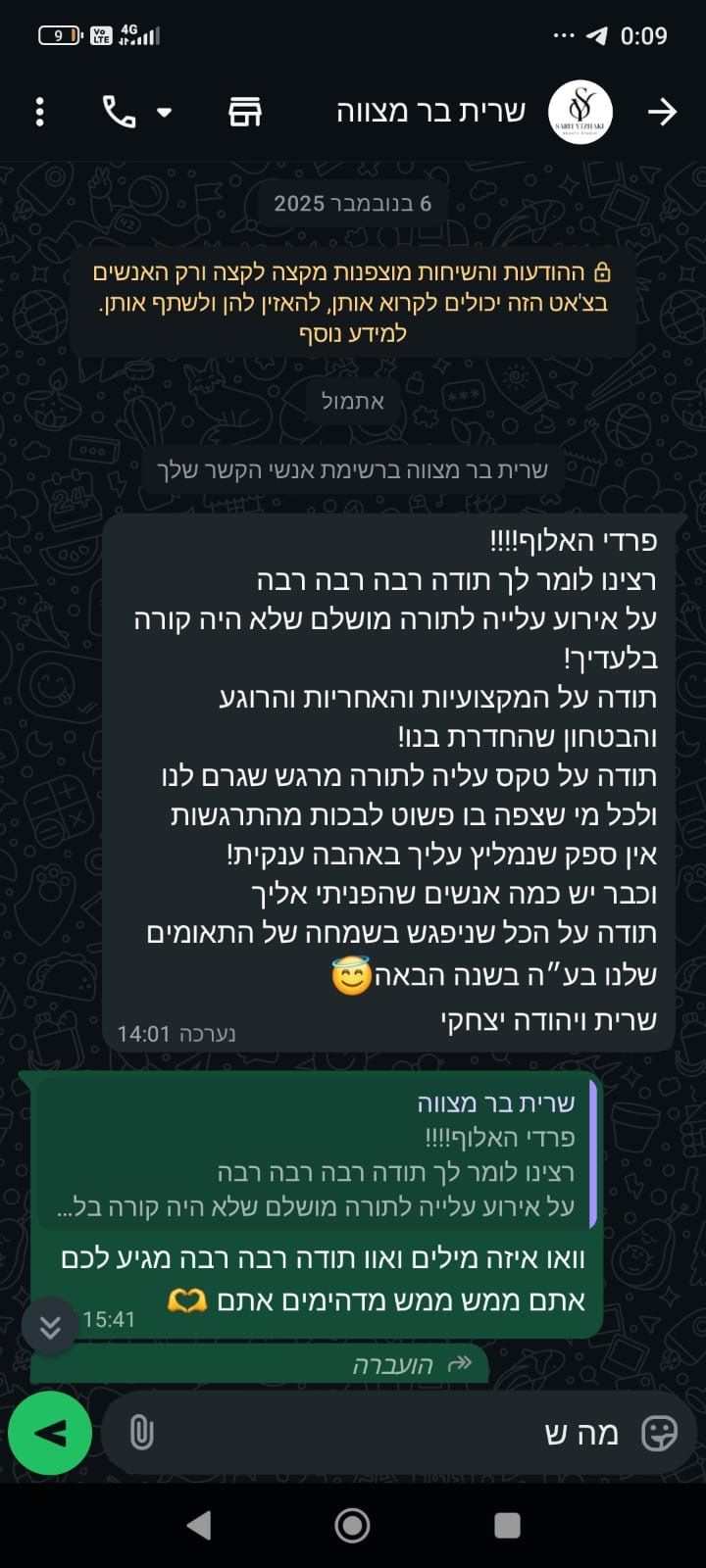 הטקס כולל תפילה מוזיקלית בליווי קלידן מקצועי, מערכת הגברה איכותית ושירים מרגשים – החל מברכת כהנים, דרך שירי תודה לאמא ולמשפחה, ועד למוזיקה שתרים את כולם על הרגליים ניתן לשלב מתופפים, נגנים נוספים, חופה חגיגית וכל אלמנט שיגרום לאירוע שלכם להיות מיוחד באמת.